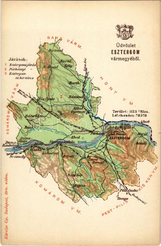 Leírás: Esztergom vármegye térképe. Kiadja Károlyi Gy.