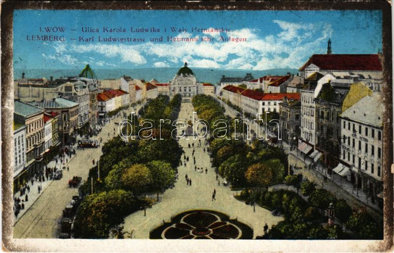 1915 Lviv, Lwów, Lemberg; Ulica Karola Ludwika i Waly Hetmanskie / Karl Ludwigstrasse und Hetmannsche Anlagen / street, square, shops, tram + "K.u.k. Militärzensur Lemberg" So. Stpl (EK)