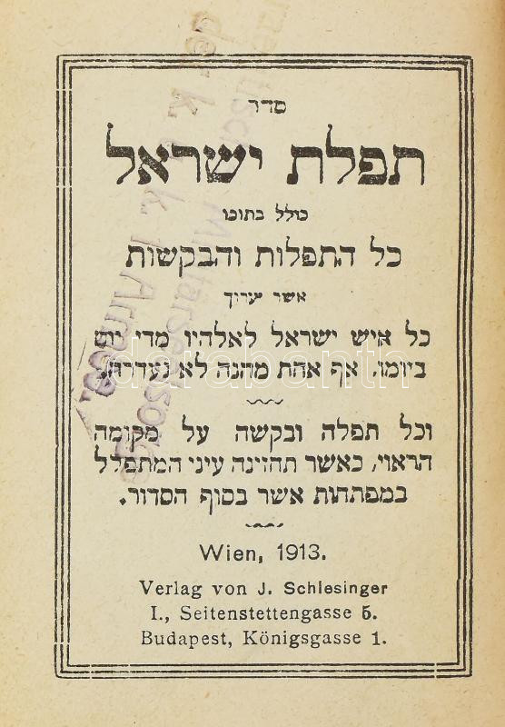Leírás: 1913 Héber nyelvű imakönyv, Magyar Királyi 39. Honvéd Gyalog Hadosztály Izraelita Tábori Lelkészete pecsétjével.