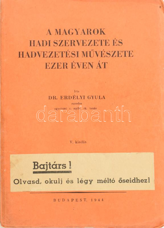 Erdélyi Gyula: A magyarok hadi szervezete és hadvezetési művészete ezer éven át. Bp., 1944, Hungária. V. kiadás. Kiadói papírkötés, kissé foltos borítóval.