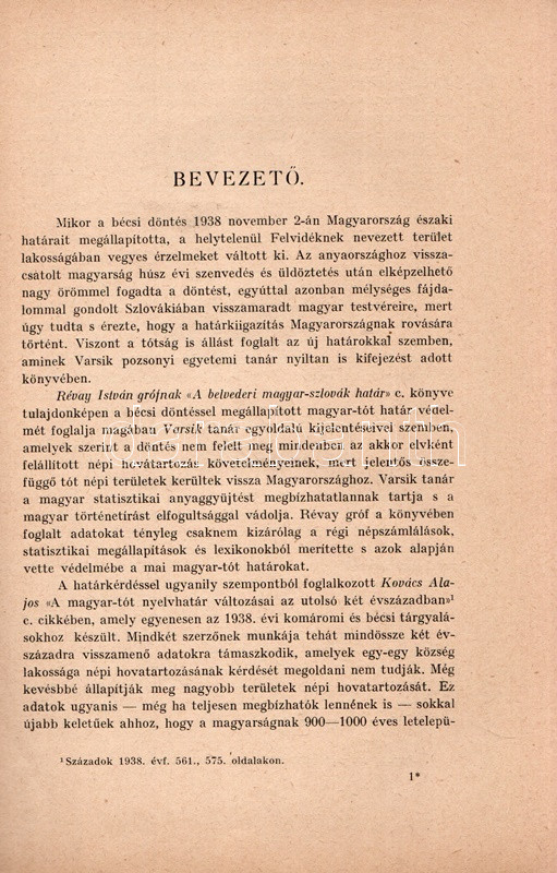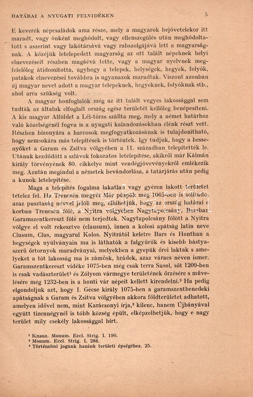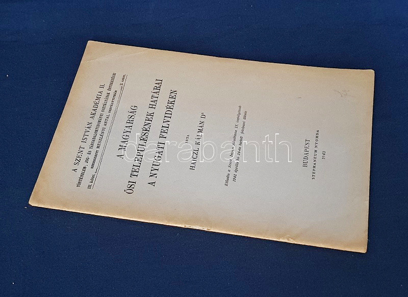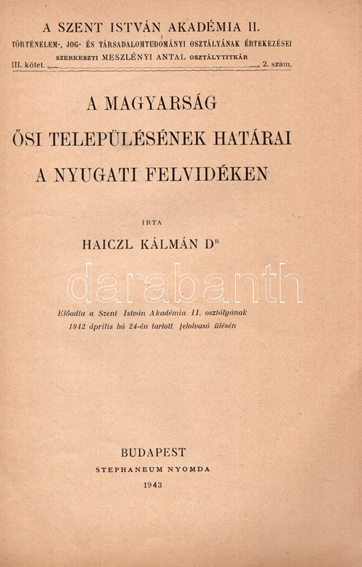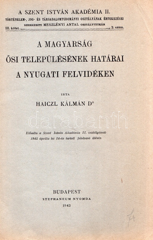 Haiczl Kálmán: A magyarság ősi településének határai a nyugati Felvidéken. Budapest, 1943. (Szerző) Stephaneum Nyomda. 33 + [3] p. Egyetlen kiadás. Haiczl Kálmán (1866-1952) garamszentbenedeki, ebedi, majd szőgyéni plébános, egyházjogi doktor, egyháztörténész, helytörténész. A Felvidék nyugati megyéiben szolgáló plébános rövid tanulmányában a magyar és szlovák településterület régi határait állapítja meg Pozsony, Nyitra, Trencsén, Bars és Hont vármegyékben. A szerző a tanulmányt a Szent István Akadémia II. osztályának 1942. április 24-i ülésén olvasta fel. (A Szent István Akadémia II. Történelem-, Jog- és Társadalomtudományi Osztályának értekezései. III. kötet, 2. szám.) Fűzve, kiadói borítóban.