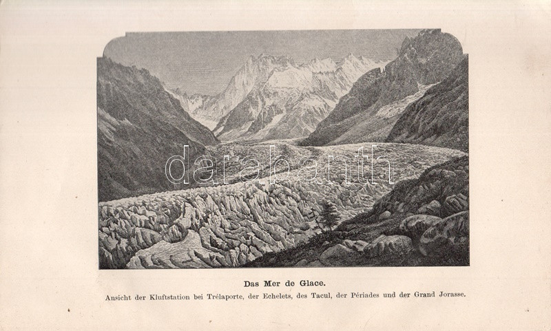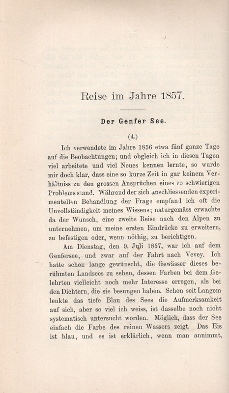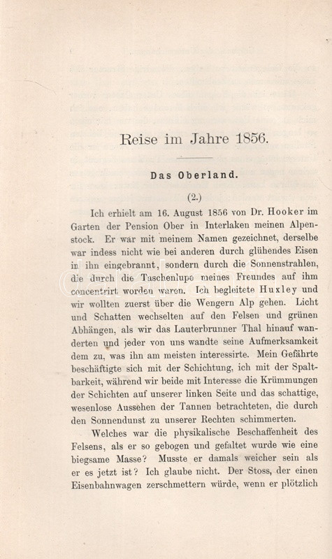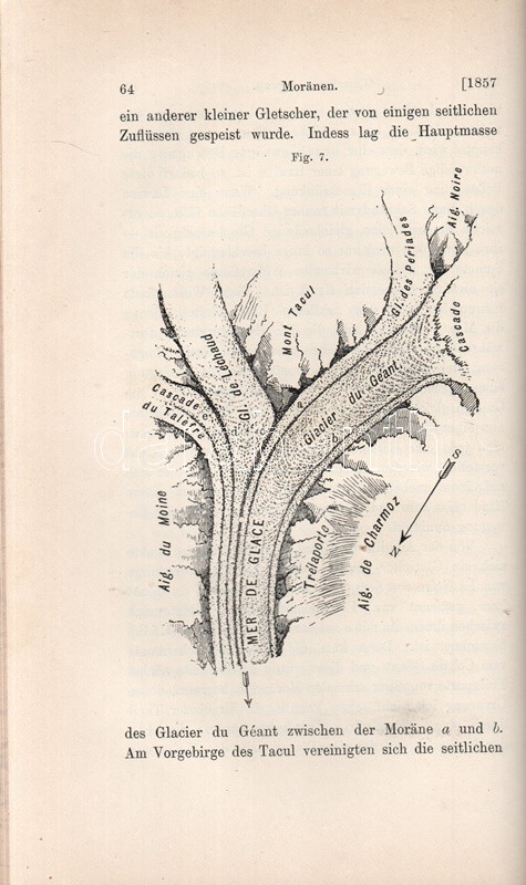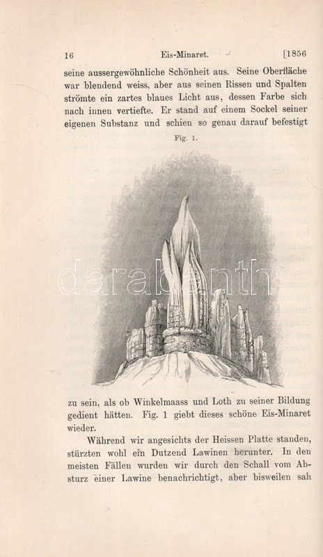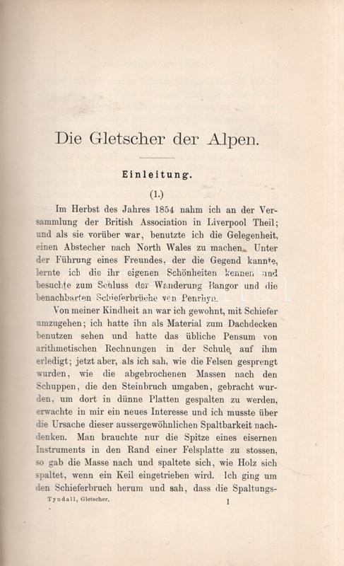 John Tyndall (1820-1893) brit fizikus, alpinista, gleccserkutató. Oldalszámozáson belül szövegközti ábrákkal illusztrált munkájában a jégfolyások, gleccserek mechanizmusait és termodinamikáját tanulmányozta, saját alpesi tapasztalatai alapján. A munka első kiadása 1860-ban jelent meg, "The Glaciers of the Alps" címmel. Az első nyomtatott oldalon régi tulajdonosi bejegyzés.