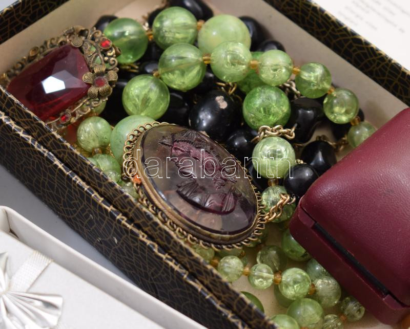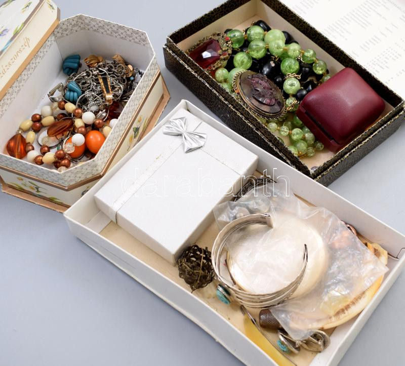 Leírás: Három kis doboznyi vegyes bizsu ékszer. nyakláncok, gyűrűk, ékszer alkatrészek, fűznivaló gyöngyök, ékszer alkatrészek