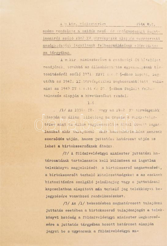 1944 Rendelet a zsidók mező- és erdőgazdasági ingatlanairól szóló 1942. XV. törvénycikk alapján megszerzett mezőgazdasági ingatlanok felhasználásáról, 5 sokszorosított oldal, utolsó lapon egy apró szöveget nem érintő sérüléssel