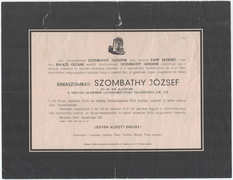 Leírás: 1941 Szombathy József ny. m. kir. alezredes gyászjelentése, szakadással