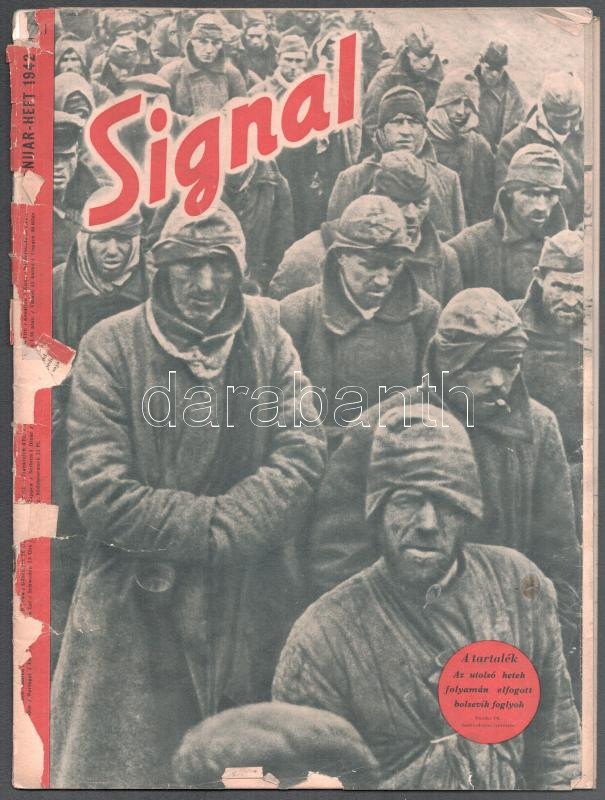 1942 Signal c. II. világháborús újság 1942. januári száma, benne háborús és egyéb írásokkal, képekkel, magyar és német nyelven. A címlapon: ,,Az utolsó hetek folyamán elfogott bolsevik foglyok". Kiadói tűzött papírkötés, sérült, a tűzéstől elvált borítóval.