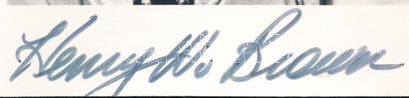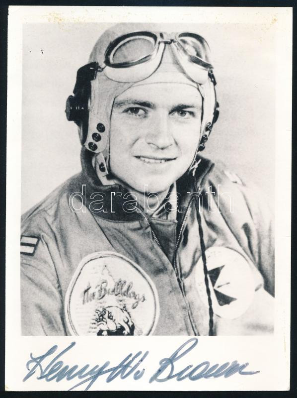 Henry William Brown (1923-2008) amerikai II. világháborús pilóta, repülő ász autográf aláírása őt ábrázoló képen (későbbi előhívás), 17x12,5 cm / Autograph signature of Henry William Brown (1923-2008) American WWII pilot, flying ace, on a photo (later copy), 17x12.5 cm