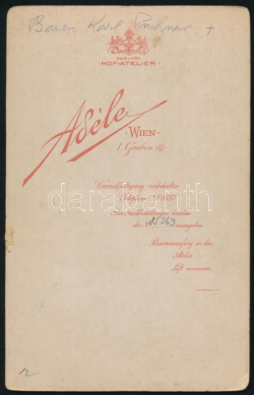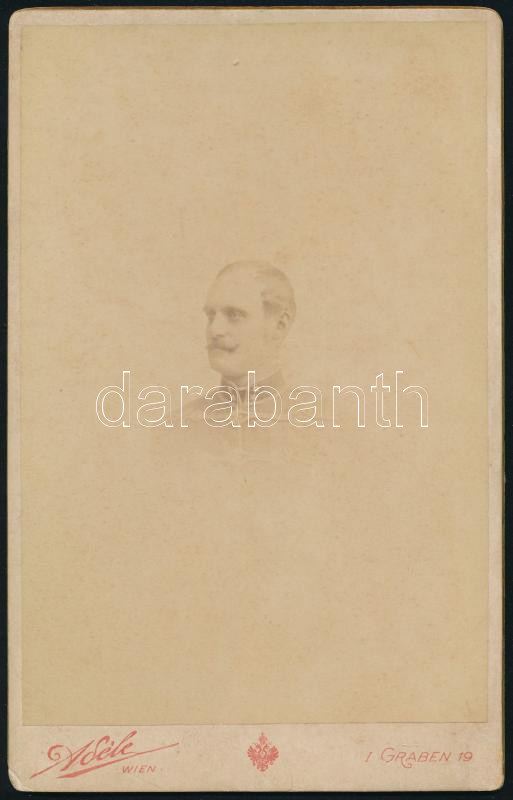 cca 1885-1890 baron Karl Puchner, feltehetően báró Puchner Károly (1862-1898) portréja huszártisztként, Adele bécsi fényképészeti műtermében készült keményhátú vintage fotó, hátoldalán nevesített, néhány apró folttal, 17,5x11 cm