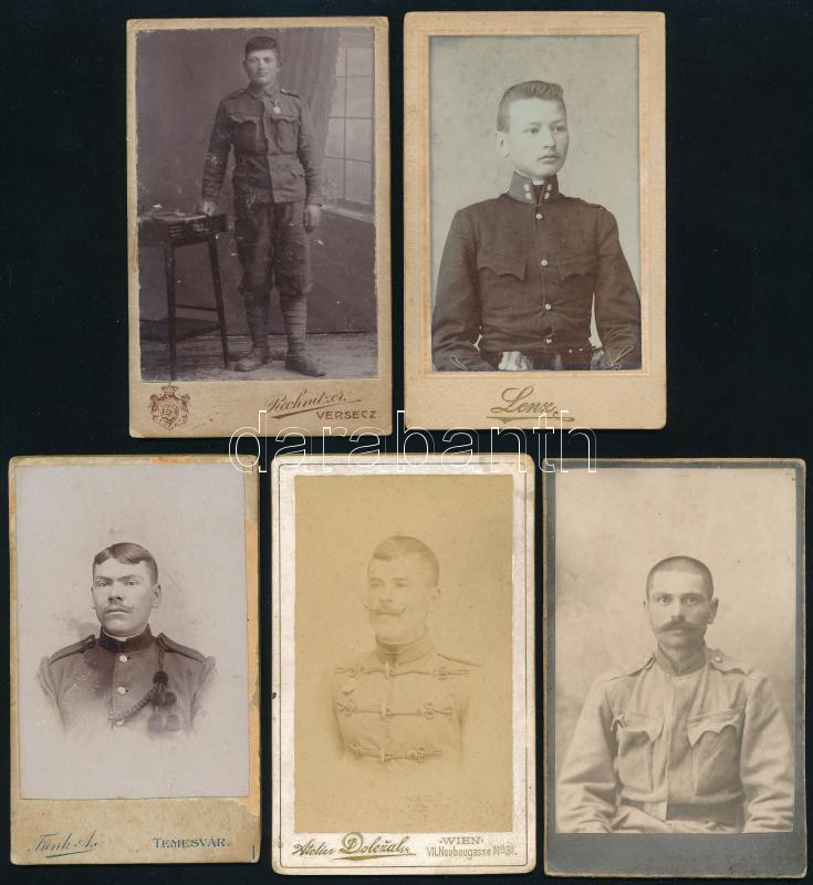 cca 1890-1910 Katonaportrék, 5 db vizitkártya különböző műtermekből (Rechnitzer István Versec, Funk A. Temesvár, stb.), változó állapotban, 11x6,5 cm körül
