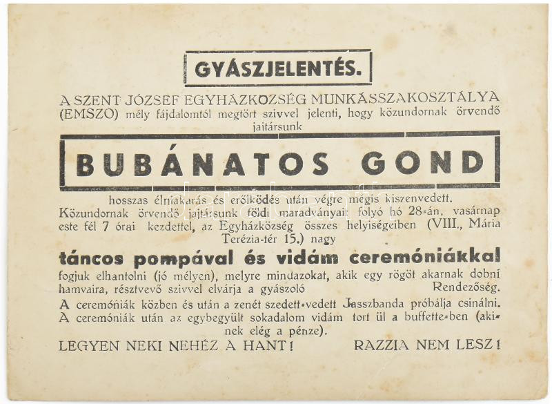 Leírás: Humoros gyászjelentés, meghívó a Szent József Egyházközség Munkásosztályának ünnepségére, folttal, 11,5x15,5 cm