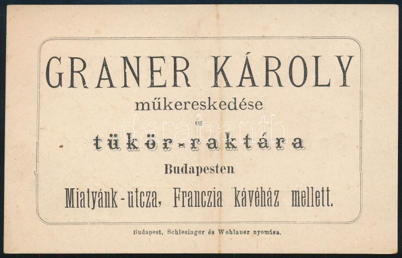 Leírás: cca 1890 Garner Károly műkereskedése Miatyánk utca két nyelvű reklám kártya 13x9 cm