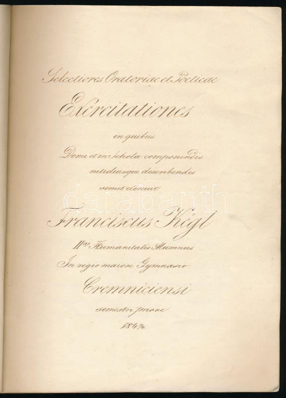 1843-44 Körmöcbánya, Kégl Ferenc diák latin-magyar-német ny. kézzel írt füzete, 31 sztl. oldal, papírborítón apró szakadással, lapokon kisebb foltokkal