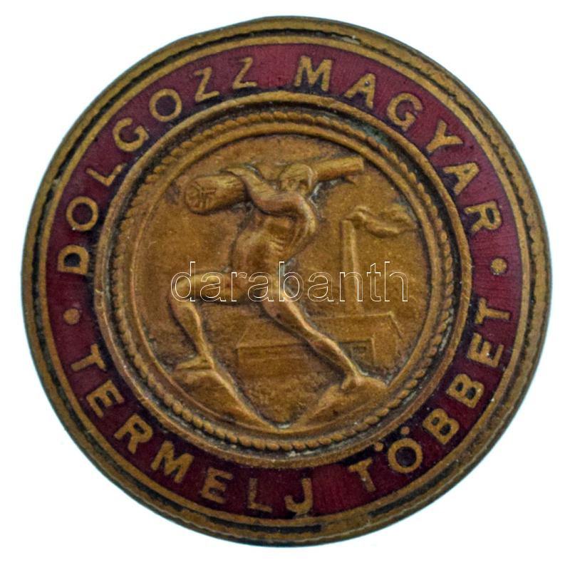 ~1950. "Dolgozz magyar, termelj többet" zománcozott bronz jelvény (26m... https://www.darabanth.com/hu/482-Gyorsarveres/482.0/Numizmatika/Falerisztika-Kituntetesek-jelvenyek~1000020/7E1950-Dolgozz-magyar-termelj-tobbet-zomancozott-bronz-jelveny-26mm-T-AU-XF~II3293327