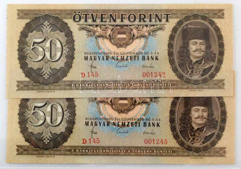 Leírás: 1965. 50Ft (2x) közeli, viszonylag alacsony "D 145 001242" és "D 145 1245" sorszámokkal T:UNC,AU