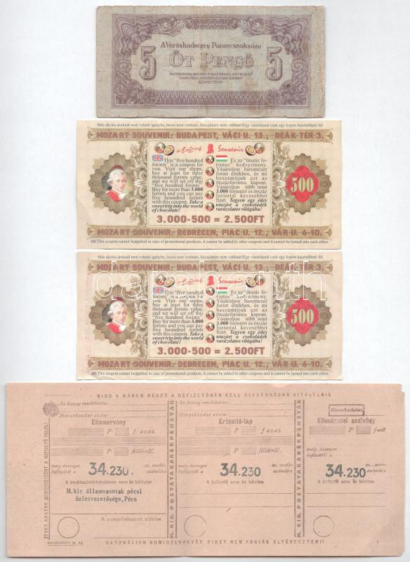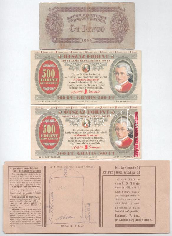 Leírás: Vegyes utalvány, bankjegy tétel, közte 1944. 5P "A Vöröshadsereg Parancsnoksága", DN "500 forint Mozart Souvenir" utalvány (2x) T:F