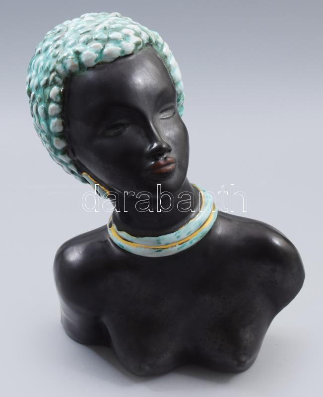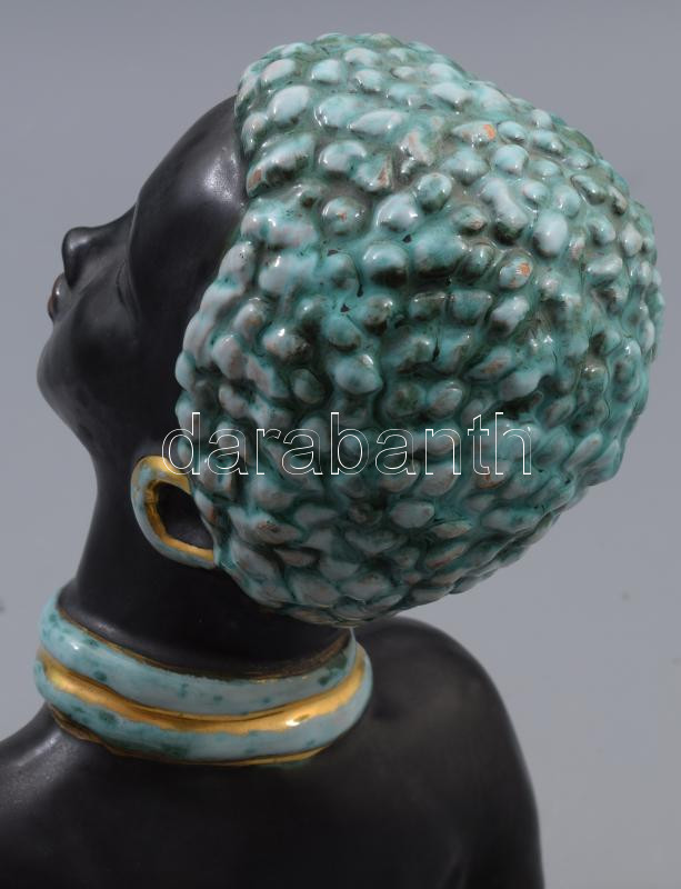 Leírás: Art deco fekete néger nő félakt. Mázas kerámia, jelzés nélkül, apró mázhibával 24 cm