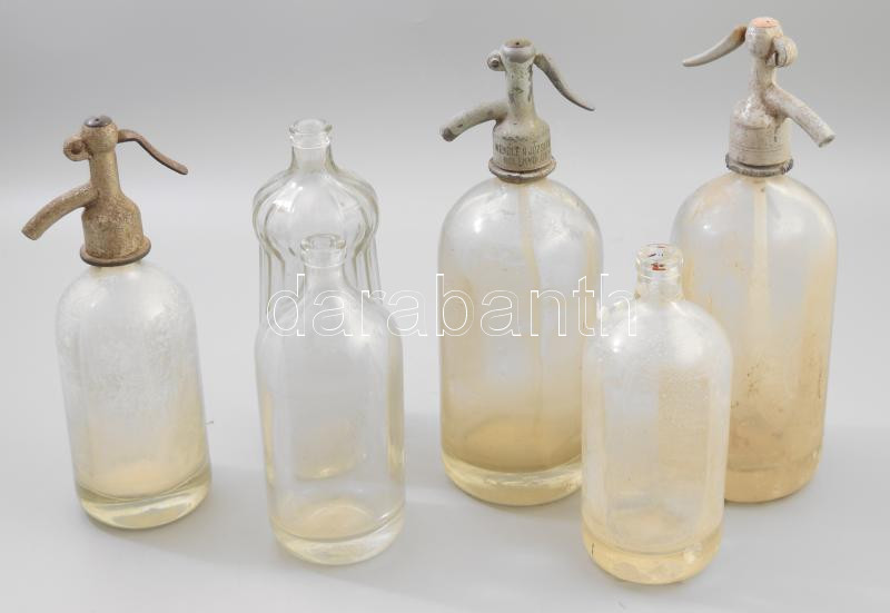 Leírás: 6 darab klf antik feliratos szódásüveg, közte sérüléssel, m: 21-31 cm, rákoshegyi, edelényi, szegedi, kelenvölgyi, egri, hódmezővásárhelyi szódások.