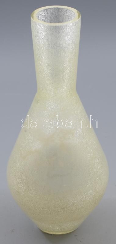 Leírás: Karcag Berekfürdői krakléüveg uránüveg váza, szájánál pattogzással, m: 26 cm