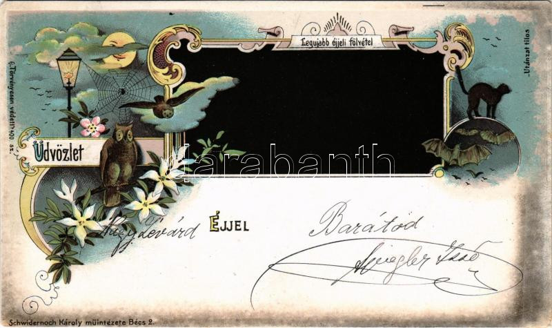 1898 (Vorläufer) Üdvözlet Éjjel. Legújabb éjjeli fölvétel. Szecessziós művészlap bagollyal és denevérrel / Night view, Art Nouveau greeting art postcard woth owl and bat. Schwidernoch Károly floral, litho