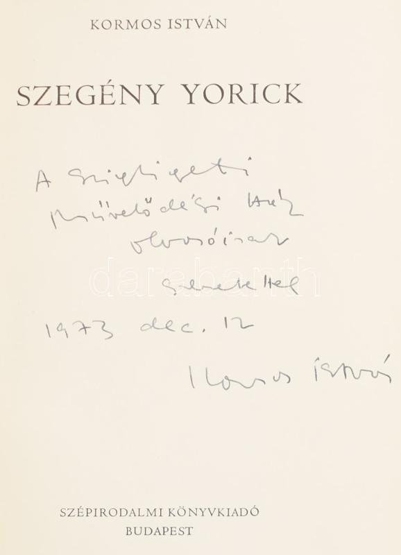 Kormos István: Szegény Yorick. A szerző, Kormos István (1923-1977) magyar költő, író, műfordító által DEDIKÁLT példány. Bp.,1971, Szépirodalmi. Első kiadás. Kiadói egészvászon-kötés, volt könyvtári példány. Megjelent 2900 példányban.