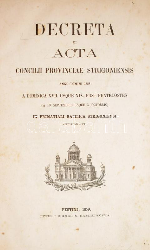 Decreta et acta concilii provinciae Strigoniensis anno domini 1858 [...] Pestini, 1859, Typ. J. Beimel & Basilii Kozma, 3 sztl. lev.+ 234 p. Latin nyelven. Korabeli aranyozott, bordázott gerincű félbőr-kötésben, kissé viseltes, sérült borítóval, helyenként kissé foltos lapokkal.