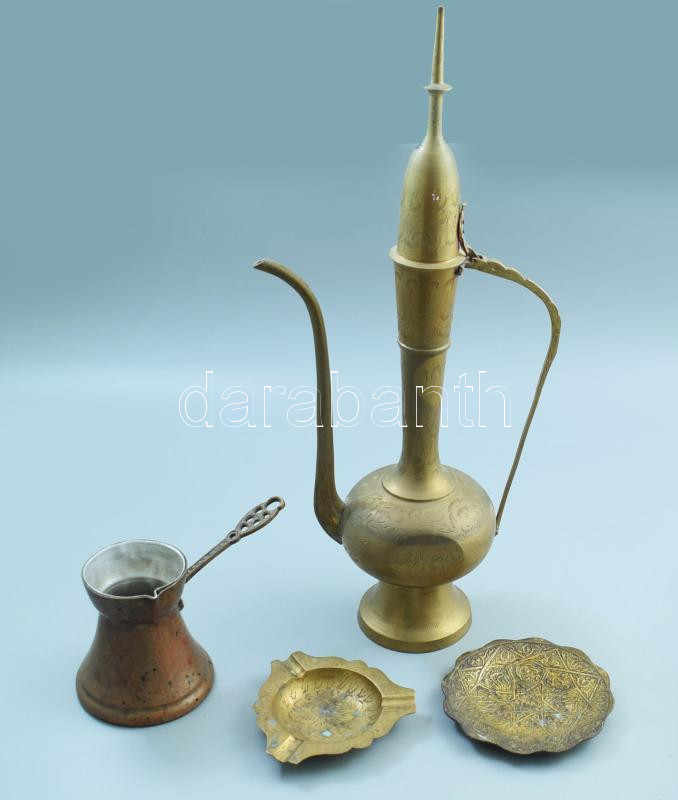 Leírás: 4 darab réz / bronz tárgy, közte karaffa m: 46 cm