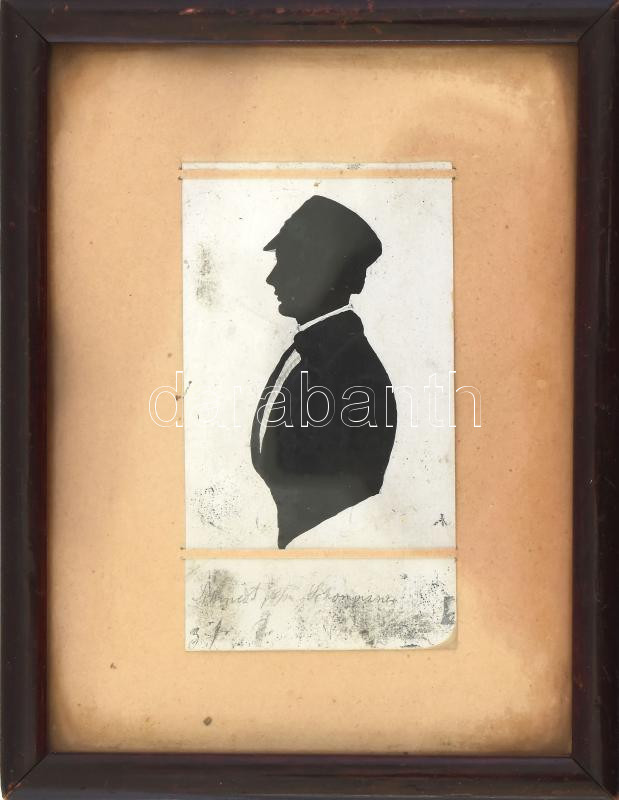 Leírás: Árnykép, papír, jelzés nélkül, olvashatatlan német ny. felirattal, XIX. sz. közepe, üvegezett fakeretben, kissé foltos, 8x4,5 cm