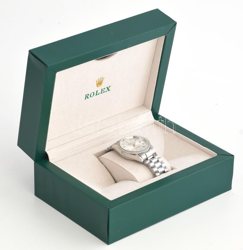 Leírás: Rolex Oyster Perpetual automata karóra, igényes gyűjtői replika, Wimbledon számlappal, naptárkijelzéssel, igazolókártyával, díszdobozban, működő, hibátlan állapotban, számlap d: 33 mm
