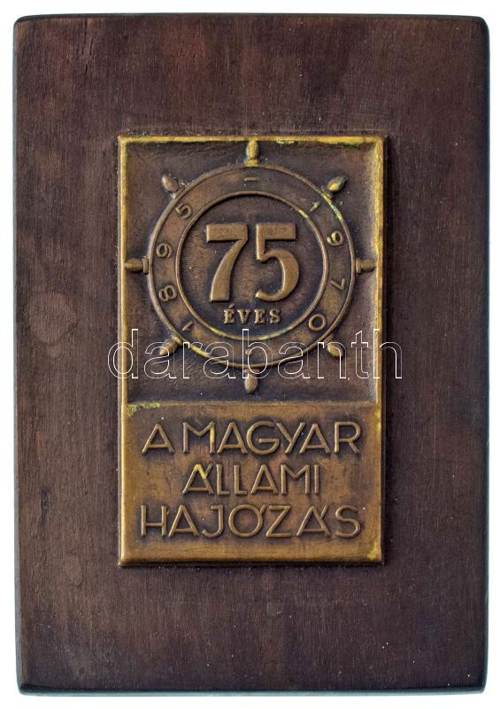 Leírás: 1970. "75 éves a Magyar Állami Hajózás 1895-1970" bronz lemezplakett (80x49mm) fa talapzaton (126x88mm) T:XF patina