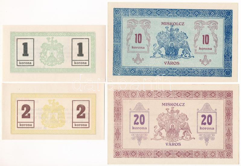 Hungary / Miskolc 14.05.1919. 1 Korona + 2 Korona + 10 Korona + 20 Korona "Miskolcz város", all with numbering, full set! C:UNC-AU