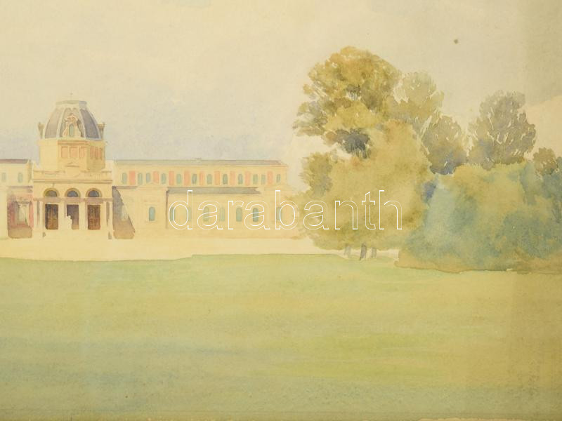 Jelzés nélkül, XIX. sz. vége/XX. sz. eleje: Szent Margit Gyógyfürdő épülete a Margitszigeten, Budapesten. Akvarell, papír. Üvegezett, dekoratív keretben. 34x46 cm