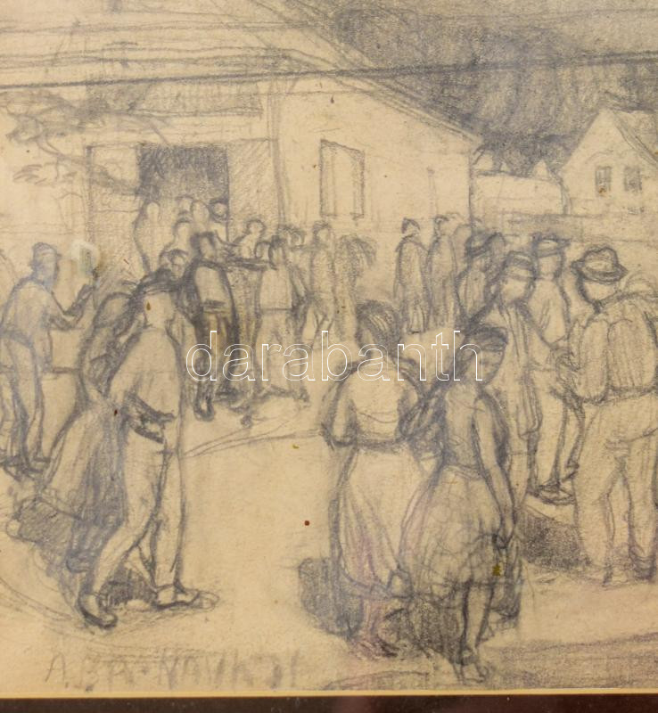 Leírás: Olvashatatlan (Aba-Novák?) jelzéssel: Emberek az utcán. Ceruza, papír, üvegezett fakeretben, 22,5x29,5 cm