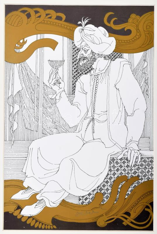 Leírás: Szász Endre (1926-2003): Emelem poharamat, szitanyomat, papír, paszpartuban, utólagos jelzéssel, 28×18 cm