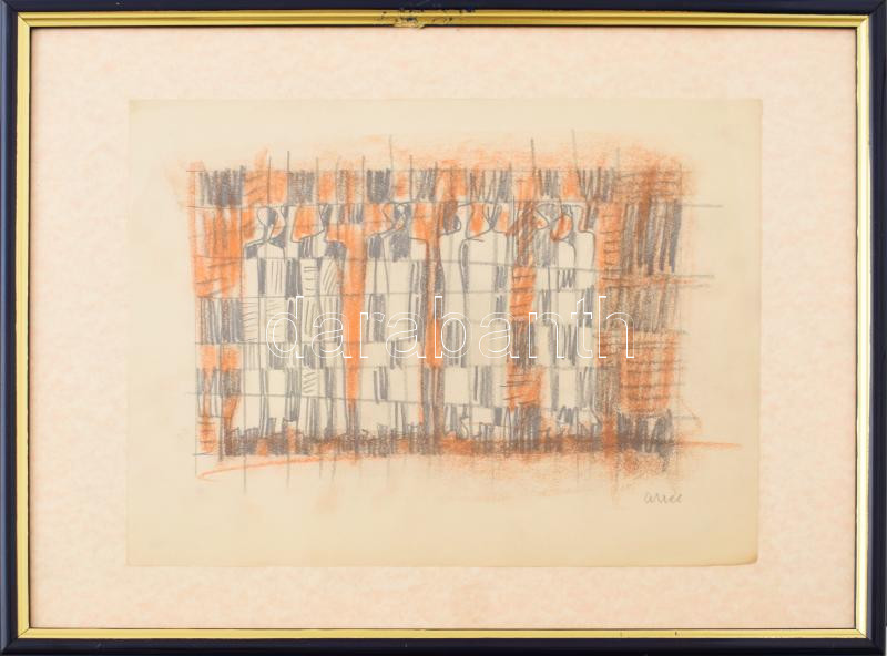 Leírás: Aczél Ilona (1929-2000): Falkép terv. Ceruza, kréta, papír, jelzett. Üvegezett fakeretben. 21x27 cm.