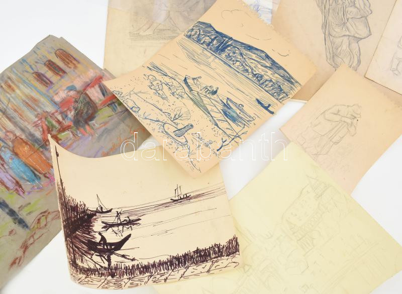 Leírás: D. Borbély Gizella (1920-1994) : 9 db vázlat és befejezett rajz pasztell, papír, vegyes technika, jelzettek 50x30 cm-ig