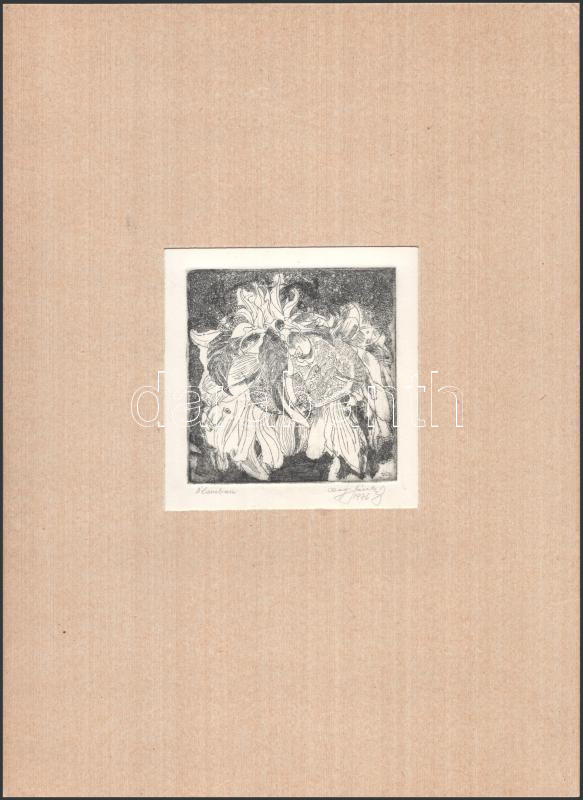 Leírás: Dégi János (-): Álomban, 1976. Rézkarc, papír, jelzett, a hátoldalán autográf ajándékozási sorokkal. Paszpartuban. 9,5×9,5 cm.