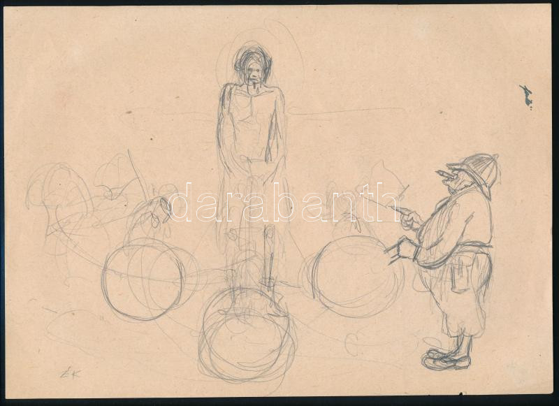 Leírás: Ék Sándor (1902-1975): Alakok (politkai karikatúra vázlata), 1950 körül. Ceruza, papír, jelzett, apró lapszéli szakadással, 21x29 cm