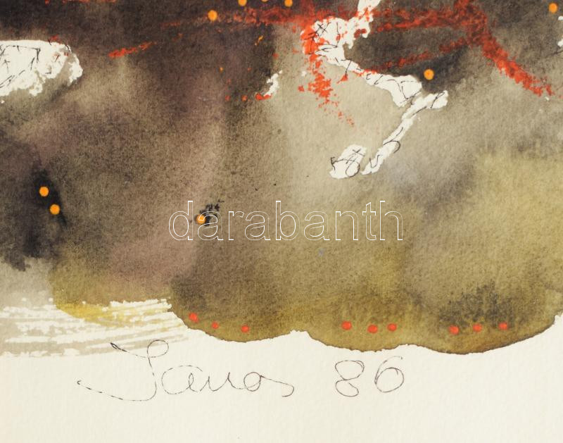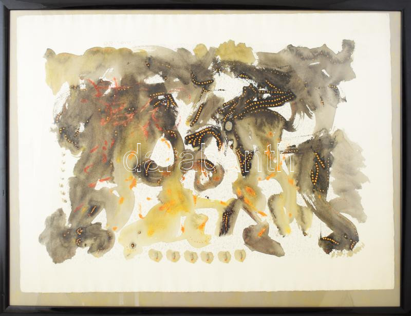 Leírás: Kardos János (1946-2018): Kompozíció, 1986. Vegyes technika, papír. Jelezve jobbra lent. Üvegezett fakeretben. 56x77 cm