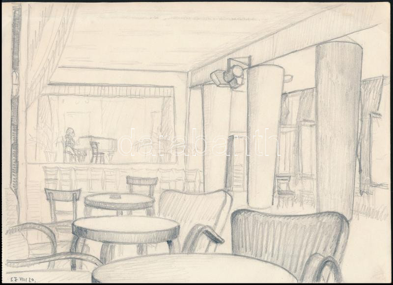 Leírás: Nolipa István Pál (1907-1986): Zenész a zongoránál, Rendőrklub, Népköztársaság útja, 1957 aug. 20. Ceruza, papír. Jelzett. 20,5x28 cm