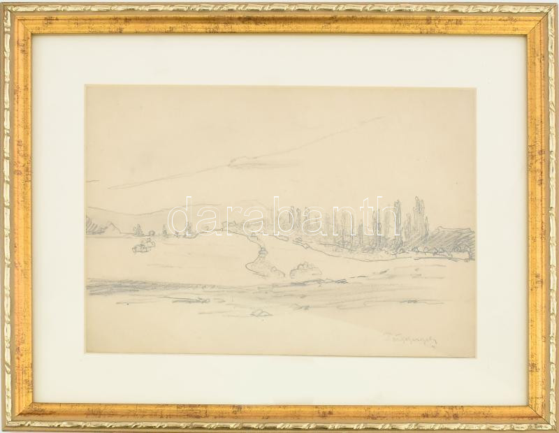 Leírás: Pörge Gergely (1858-1930): Dombos táj. Ceruza, papír, jelzett, üvegezett fakeretben, 16x23 cm