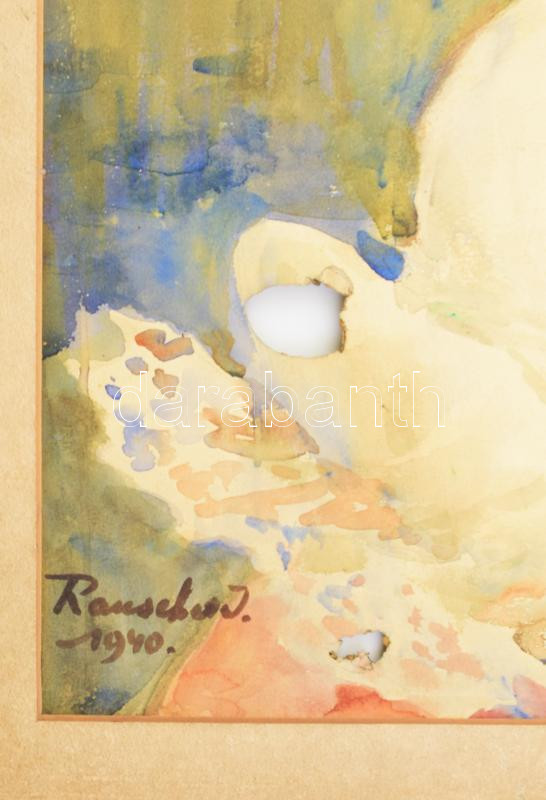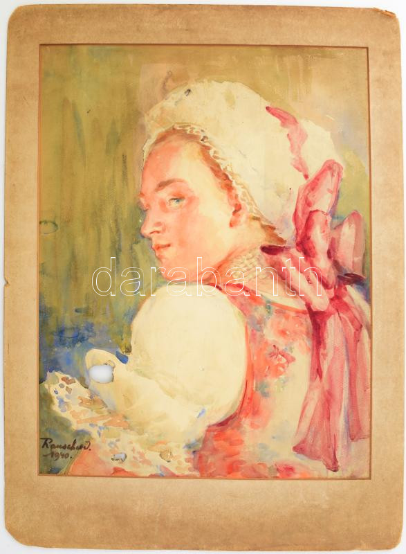 Leírás: Rauscher Juliska (1888-1947): Lány népviseletben (Buják?), 1940. Akvarell, papír, jelzett, sérült. Paszpartuban, 52,5×40 cm.