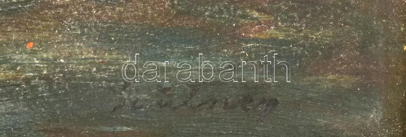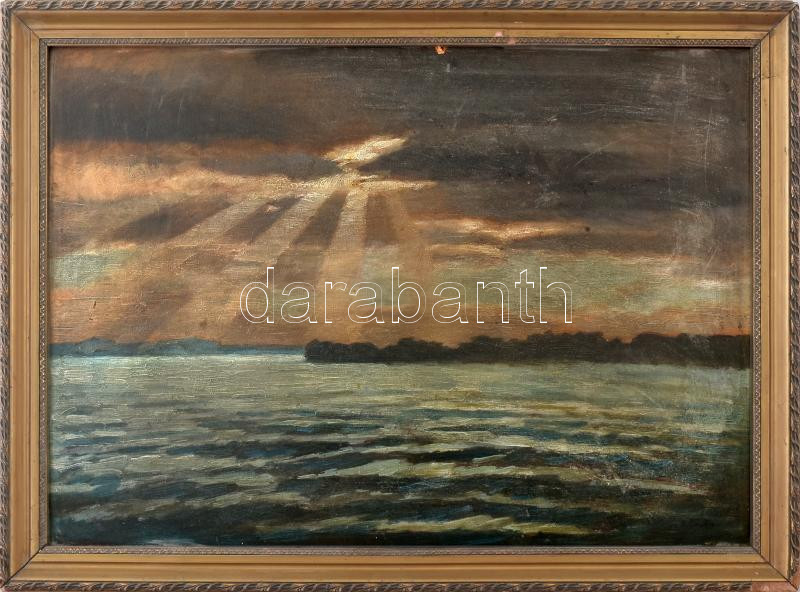 Sautner Lipót (1889-?): Vízparti fények. Olaj, karton, jelezve jobbra lent, hátoldalán régi raglapokkal, egyiken Budapest Főváros IV (...) bélyegzővel. Kissé sérült. Dekoratív, sérült fakeretben, 50×70 cm
