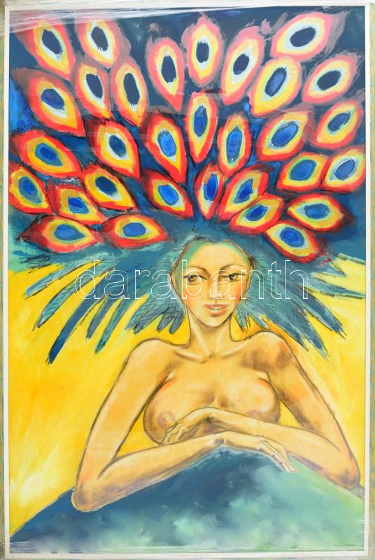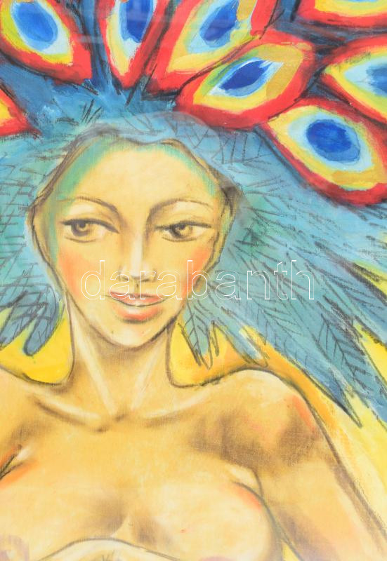 Sörös Pál (1956-): Pávatollas akt. Pasztell, vászon. Jelzett. Dekoratív, üvegezett fakeretben. 100x66 cm. KIZÁRÓLAG SZEMÉLYES ÁTVÉTEL, NEM POSTÁZZUK / ONLY PERSONAL COLLECTION IN OUR OFFICE!