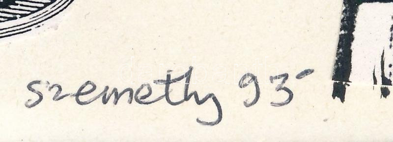 Szemethy Imre (1945-): Retúrgólem (...), 1993. Tus, kollázs, karton, jelzett. Megjelent az Élet és Irodalom folyóiratban. Hátoldalán feliratozott. Apró lapszéli szakadásokkal. 21x23 cm