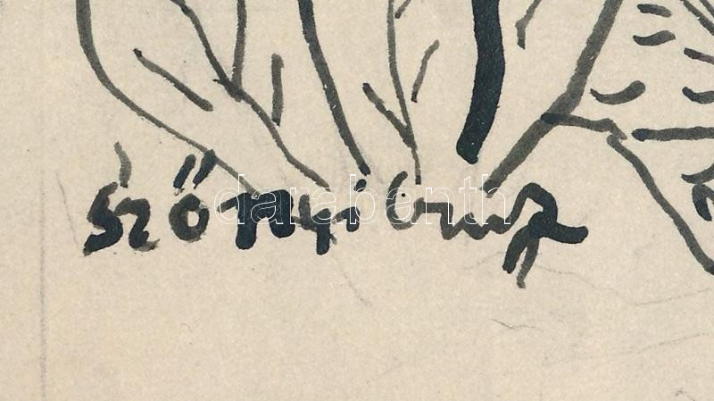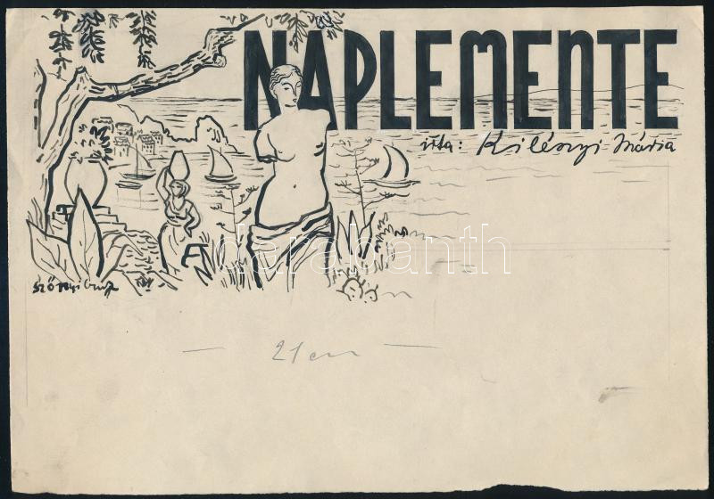 Leírás: Szőnyi Gyula (1919-2014): Illusztráció Kilényi Mária Naplemente c. művéhez. Tus, papír, jelzett. 17,5x25 cm