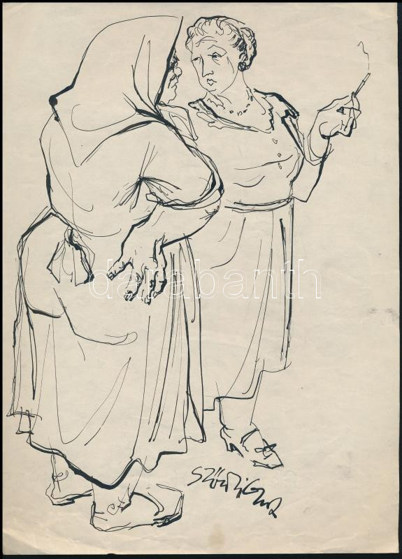 Leírás: Szőnyi Gyula (1919-2014): Tere-fere. Tus, papír, jelzett. Lapszéli apró gyűrődésekkel. 28,5x20,5 cm