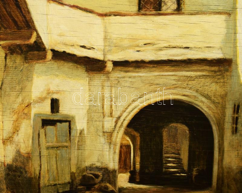 Várady Gyula (1866-1929): Udvar, 1917. Olaj, fa. Jelezve balra lent. Hátoldalán kissé töredékes korabeli raglappal (Műcsarnok?). Dekoratív, áttört, sérült keretben. 63x80 cm. KIZÁRÓLAG SZEMÉLYES ÁTVÉTEL, NEM POSTÁZZUK! / ONLY PERSONAL COLLECTION AT OUR OFFICE!