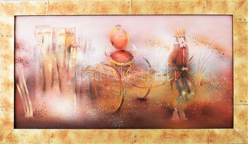 Leírás: Várkonyi János (1947-): A bukott király. Olaj, farost. Jelzett. A hátoldalán autográf felirattal. Fakeretben, 40×75 cm