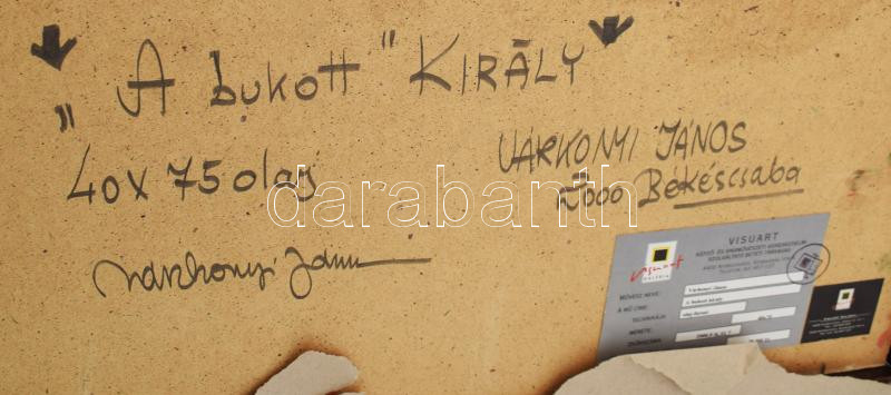 Várkonyi János (1947-): A bukott király. Olaj, farost. Jelzett. A háto... https://www.darabanth.com/hu/484-Gyorsarveres/484.0/Festmenyek-es-grafikak/Festmenyek-es-grafikak~1500001/Varkonyi-Janos-1947-A-bukott-kiraly-Olaj-farost-Jelzett-A-hatoldalan-autograf-feliratt~II3291662