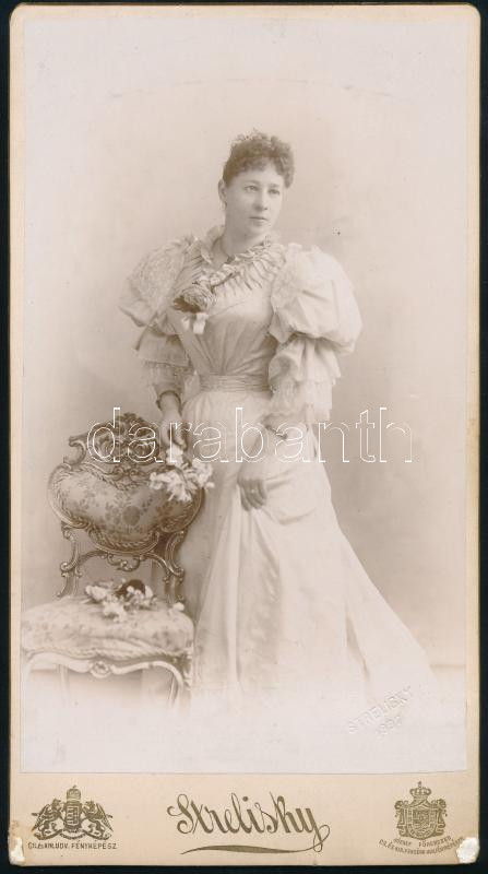 Leírás: 1897 Elegáns hölgy portréja, kabinetfotó Strelisky cs. és kir. udvari fényképész budapesti műterméből, 20,5x11 cm